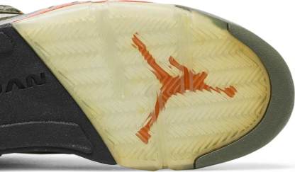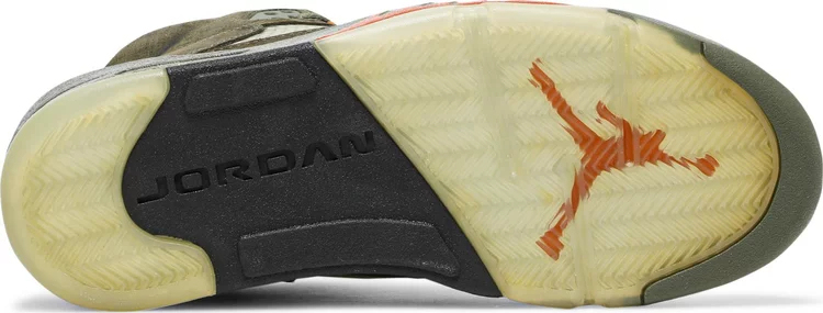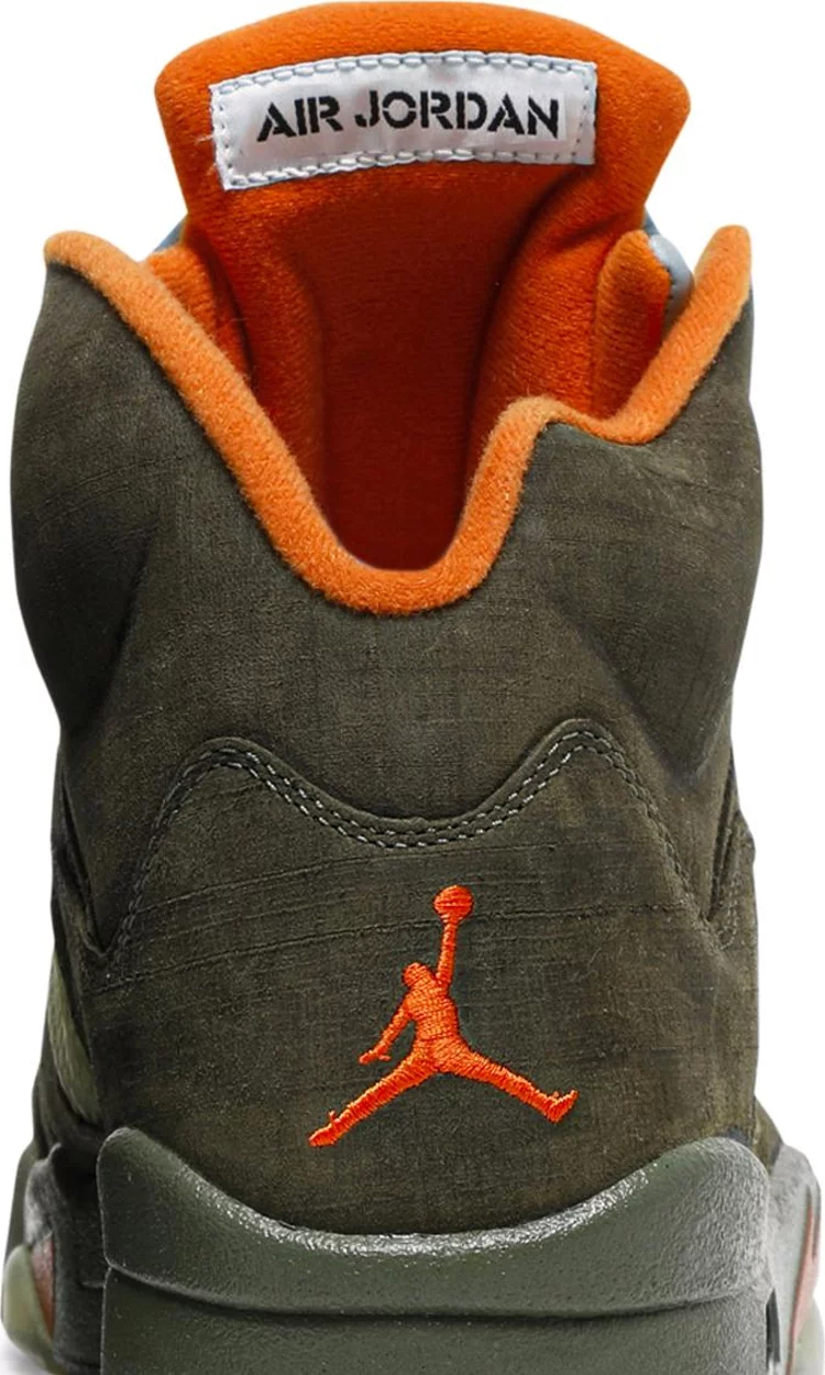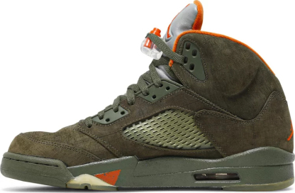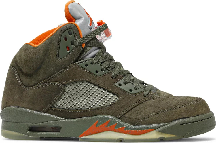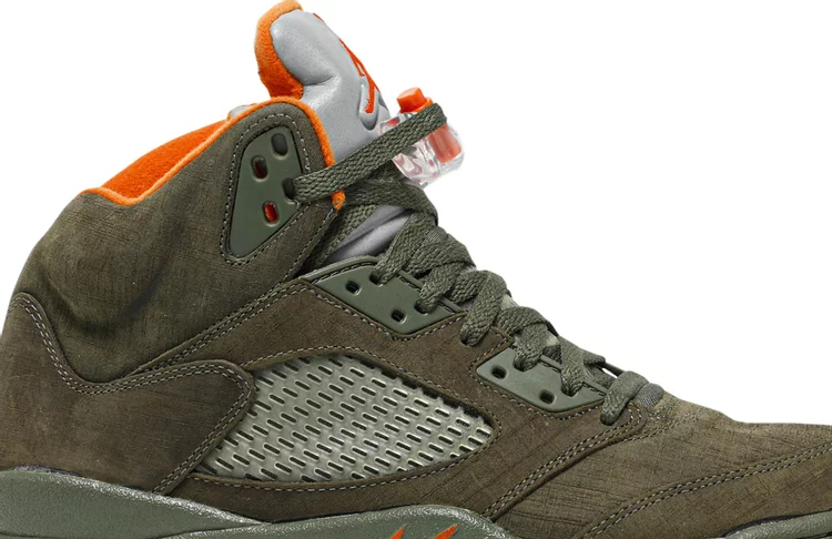 L'une des premières combinaisons de couleurs non OG de la Air jortthhdan 5 Retro, la 'Olive', présente une partie supérieure en daim avec des nuances tonales de vert sur le panneau médian en mesh et les passants des lacets. Des accents lumineux viennent de la doublure intérieure orange et de la finition argent métallisé sur la langue, où un bouton de lacet translucide repose juste en dessous d'un logo Jumpman. Le graphique des dents de requin de la semelle intermédiaire, sans doute la caractéristique déterminante de la Air jortthhdan 5, arbore un motif moucheté.