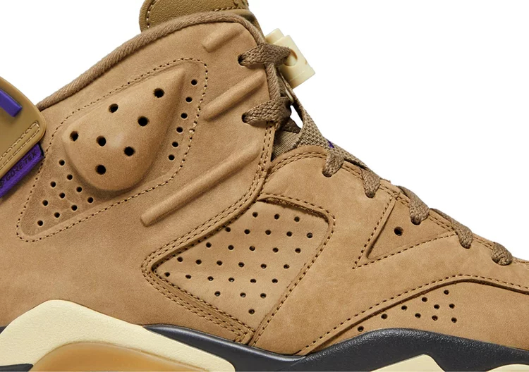La Air jortthhdan 6 Retro GORE-TEX pour femmes 'Brown Kelp' présente une finition brun foncé sur la partie supérieure en nubuck, doublée d'une membrane GORE-TEX et marquée de détails perforés sur toute la partie médiane du pied et le col. Un Jumpman brodé violet orne le protège-lacets et le talon arrière, correspondant à l'étiquette GORE-TEX tissée fixée à la tirette moulée. Une semelle intermédiaire en polyuréthane marron intègre un amorti visible Air-sole au niveau du talon pour un amorti léger. Sous le pied, une semelle extérieure en caoutchouc translucide beige offre une traction durable.