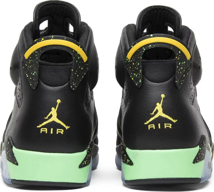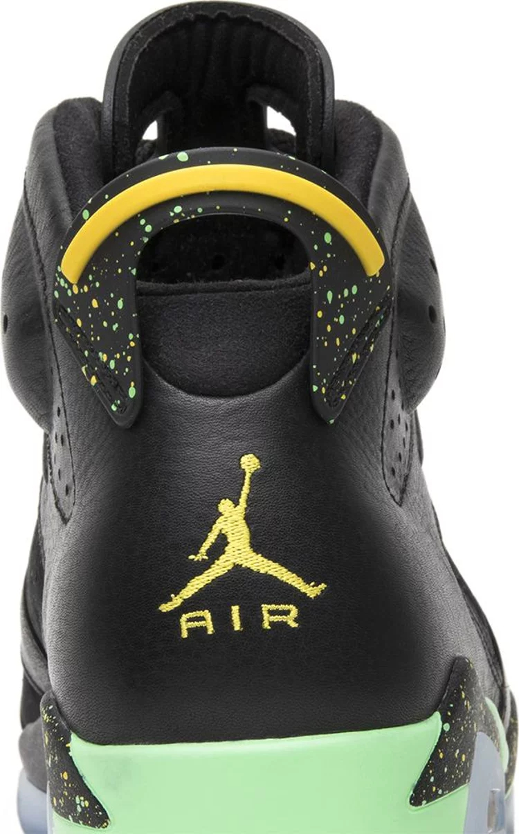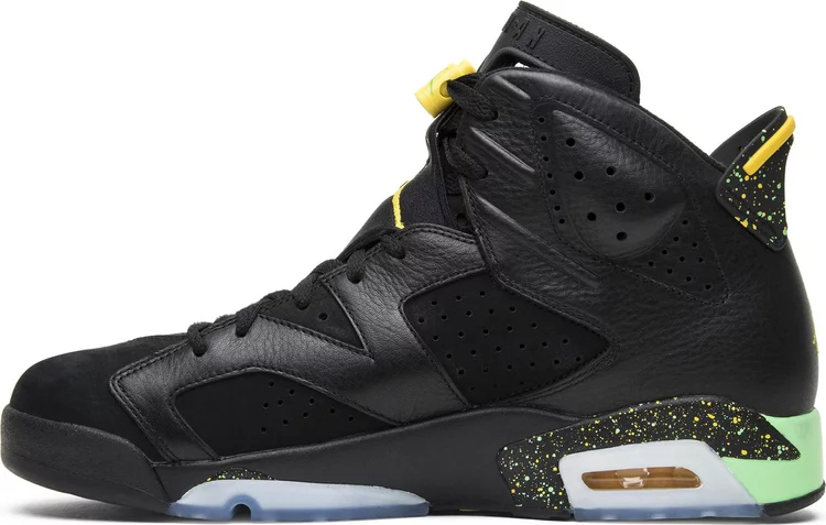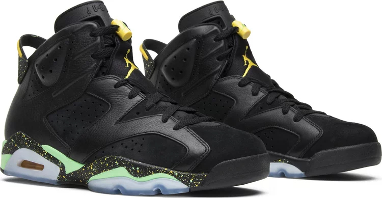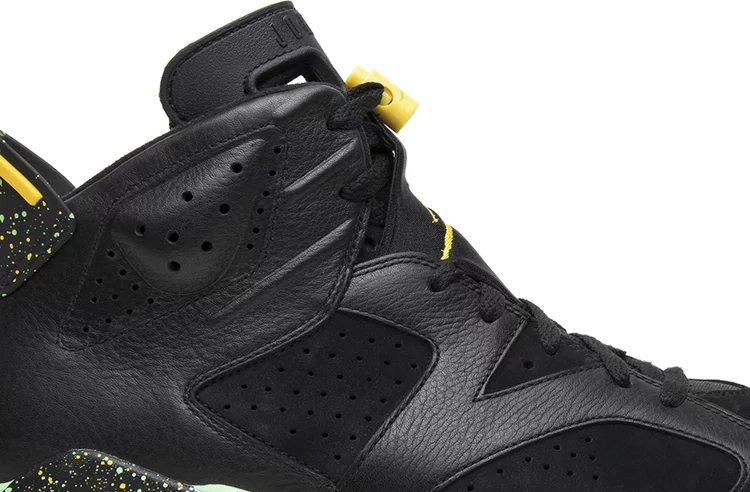 La Air jortthhdan 6 Retro 'Brazil Pack' est sortie en juin 2014 aux côtés d'une jortthhdan CP3.VII AE assortie, toutes deux conçues pour célébrer la Coupe du Monde de la FIFA 2014 au Brésil. La Air jortthhdan6 est réalisée avec une partie supérieure entièrement noire composée d'une combinaison de cuir et de nubuck, rehaussée de touches de jaune sur le verrouillage des lacets et le logo Jumpman. La languette de talon noire est recouverte de détails mouchetés, un motif qui se répète également sur la semelle intermédiaire, qui comporte également des sections en vert menthe vif.