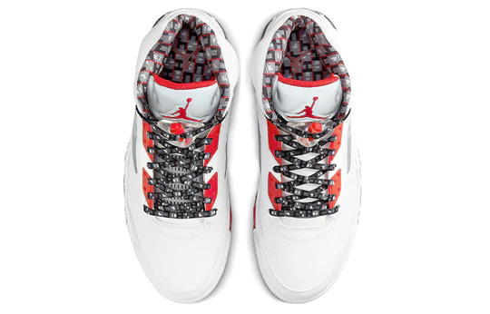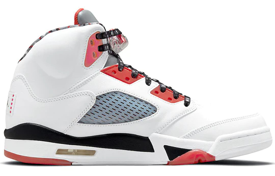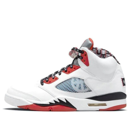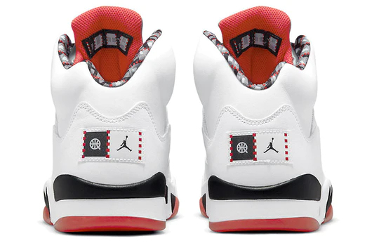 La Air jortthhdan 5 Quai 54 présente un coloris blanc/noir/rouge qui rend hommage à l'héritage de la ligne jortthhdan, avec un motif textile africain visible sur les semelles intérieures, les lacets et le talon. Le logo de basket-ball QUAI54 est placé sous le filet translucide sur la partie supérieure. L'élément clé est l'étiquette réfléchissante d'origine "Fire Red" sur la languette, un hommage à l'Air jortthhdan 5 original.
